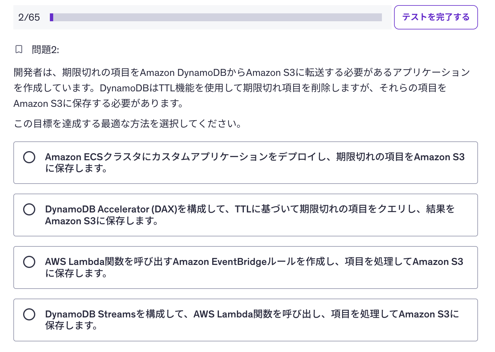 DVAの試験問題は、サービス名や機能の暗記よりも「この状況ではどのサービスをどう使うか」という実践的な判断力を問うものが多いです。