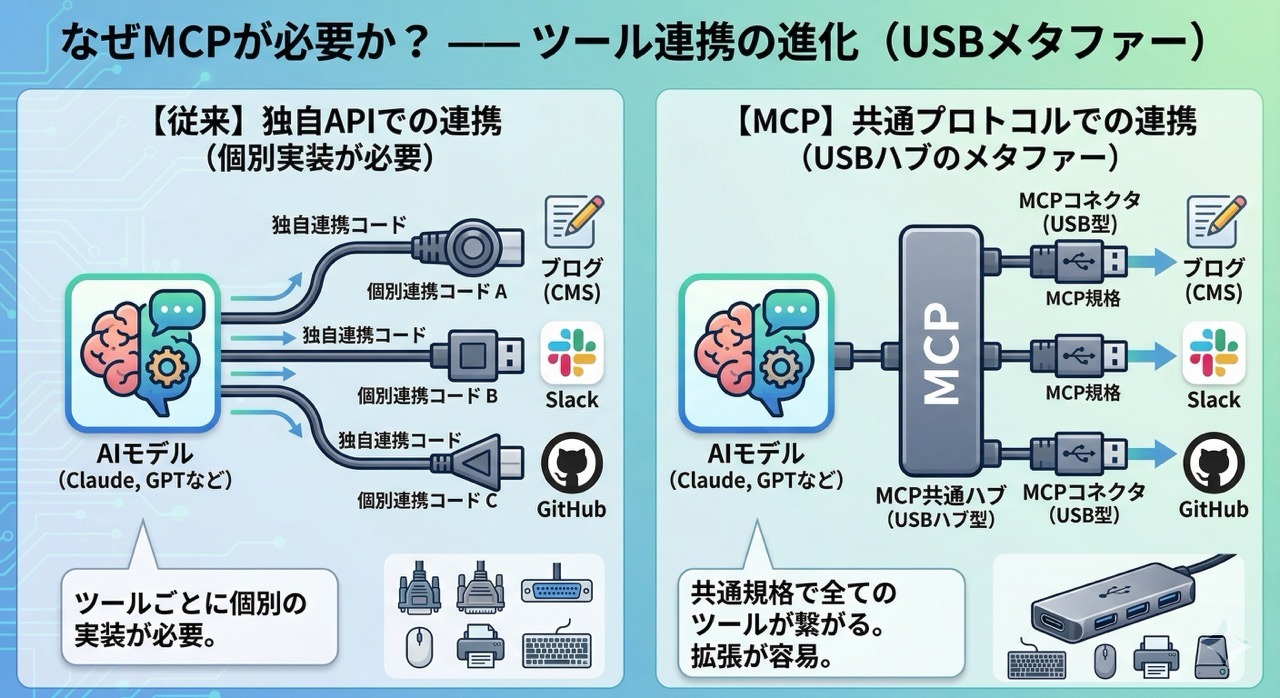 従来は、ブログ、Slack、GitHubなど、ツールごとに独自の連携コードを書く必要がありました。でもMCPがあれば、共通プロトコルで全部つながるようになります。上の図のように、MCPはまさに「USBハブ」のような存在なんです。