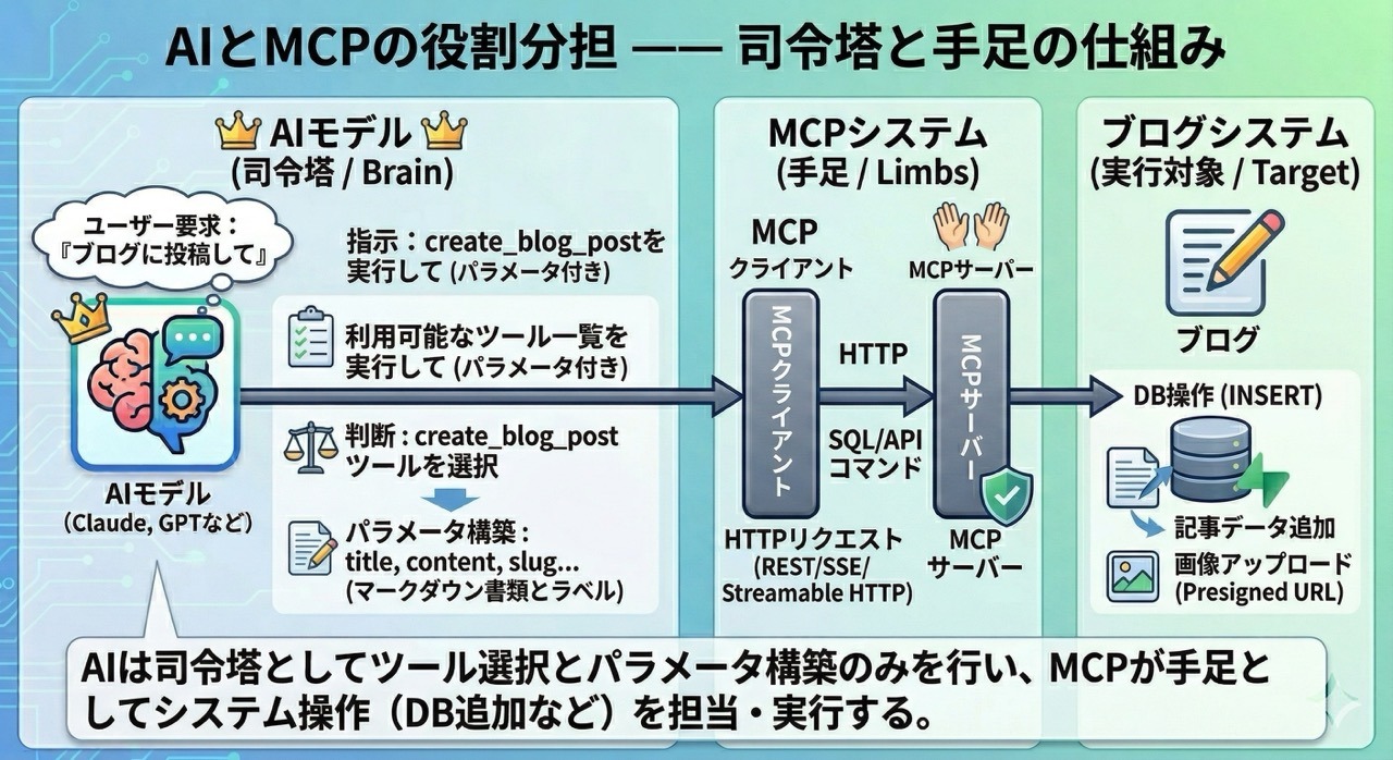 「え、それってただのAPI叩いてるだけじゃないの?」と思うかもしれません。でも実は違うんです。MCPはAIが 自分で判断して ツールを選んで実行する仕組みなんですよね。人間がAPIのエンドポイントを指定するんじゃなくて、AIが「記事を投稿したいからcreate_blog_postツールを使おう」と自分で判断してくれます。