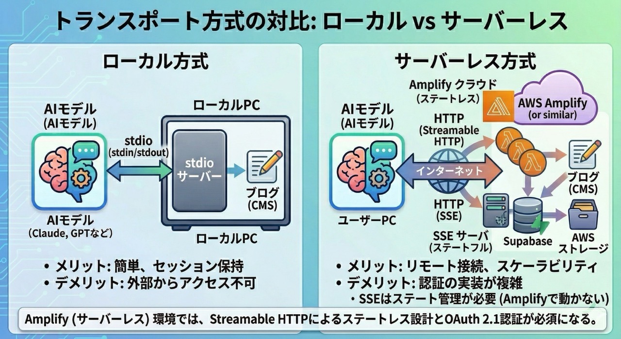 MCPには3つの接続(トランスポート)タイプがあります。ここの選定で僕はかなり遠回りをしてしまいました。