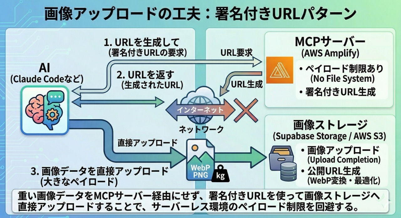 この図のように、MCPサーバーが署名付きURLを生成して、AIクライアントが画像ストレージに直接アップロードする仕組みになっています。MCPサーバーは画像データを一切扱わないので、AWS Amplifyのペイロード制限にも引っかかりません。