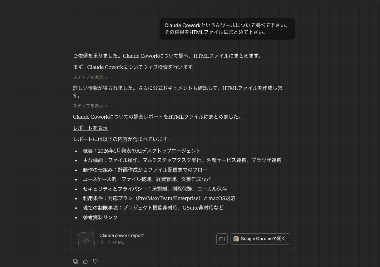 今回は、 「Cowork自体についてネットで調べて、HTMLファイルにまとめて」 というタスクを依頼してみました。